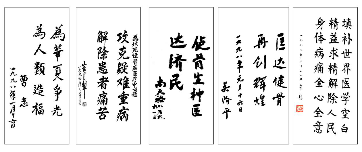 Vice Chairmen of the National People's Congress, Bu He, Wu Jieping, Cao Zhi, Minister of Health, Cui Yueli, and Professor Shang Tianyu of the Chinese Academy of Traditional Chinese Medicine, wrote congratulatory inscriptions on the release of TCM Bone-strengthening Pills.